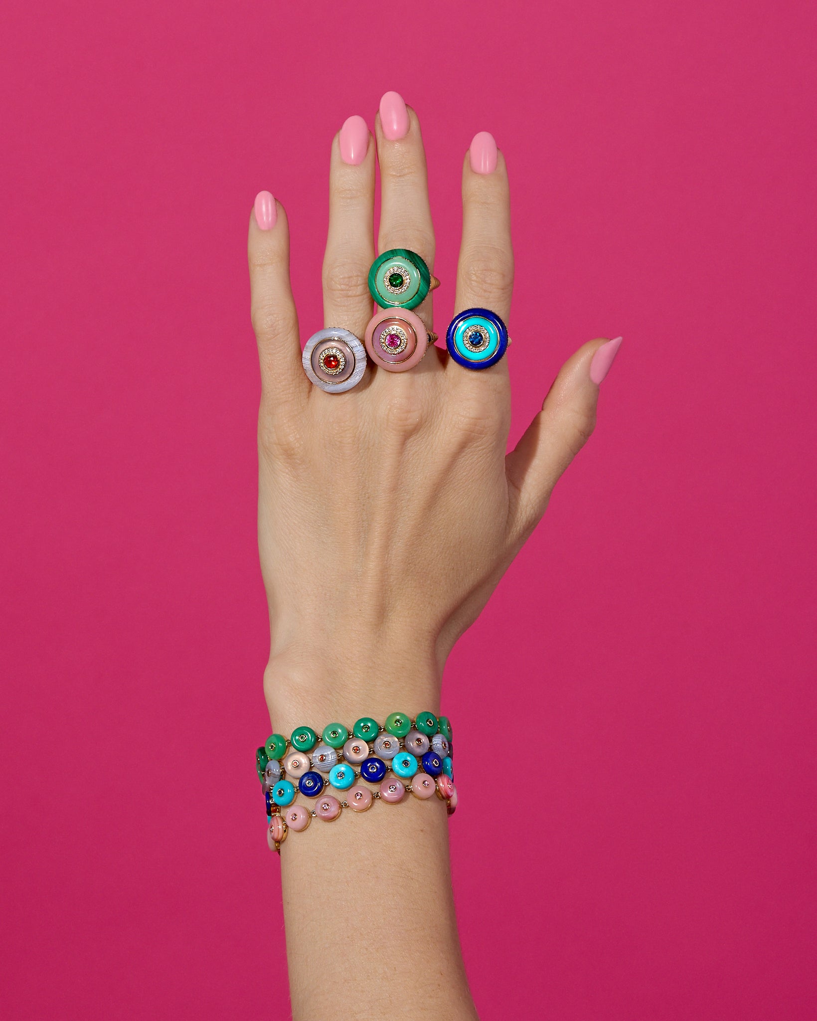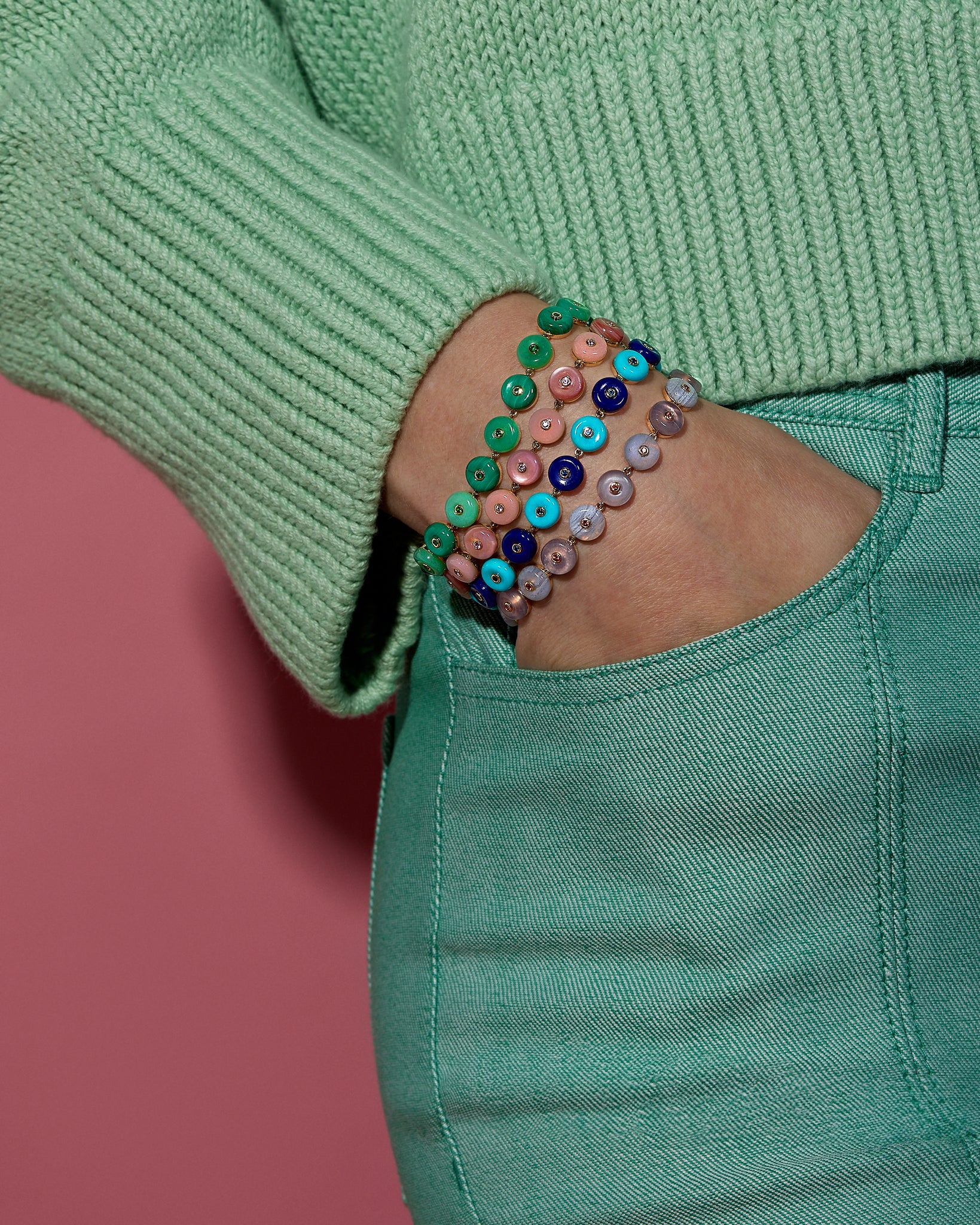 The Evolve Stone Inlay Bracelet combines textural and modern elements, using meticulously hand-cut stone inlay to form a colorful concentric design. This bracelet is adorned with custom-cut pink opal and pink mother-of-pearl inlay, and centers on a vibrant pink sapphire, creating a uniquely designed piece that is both textural and radiant.