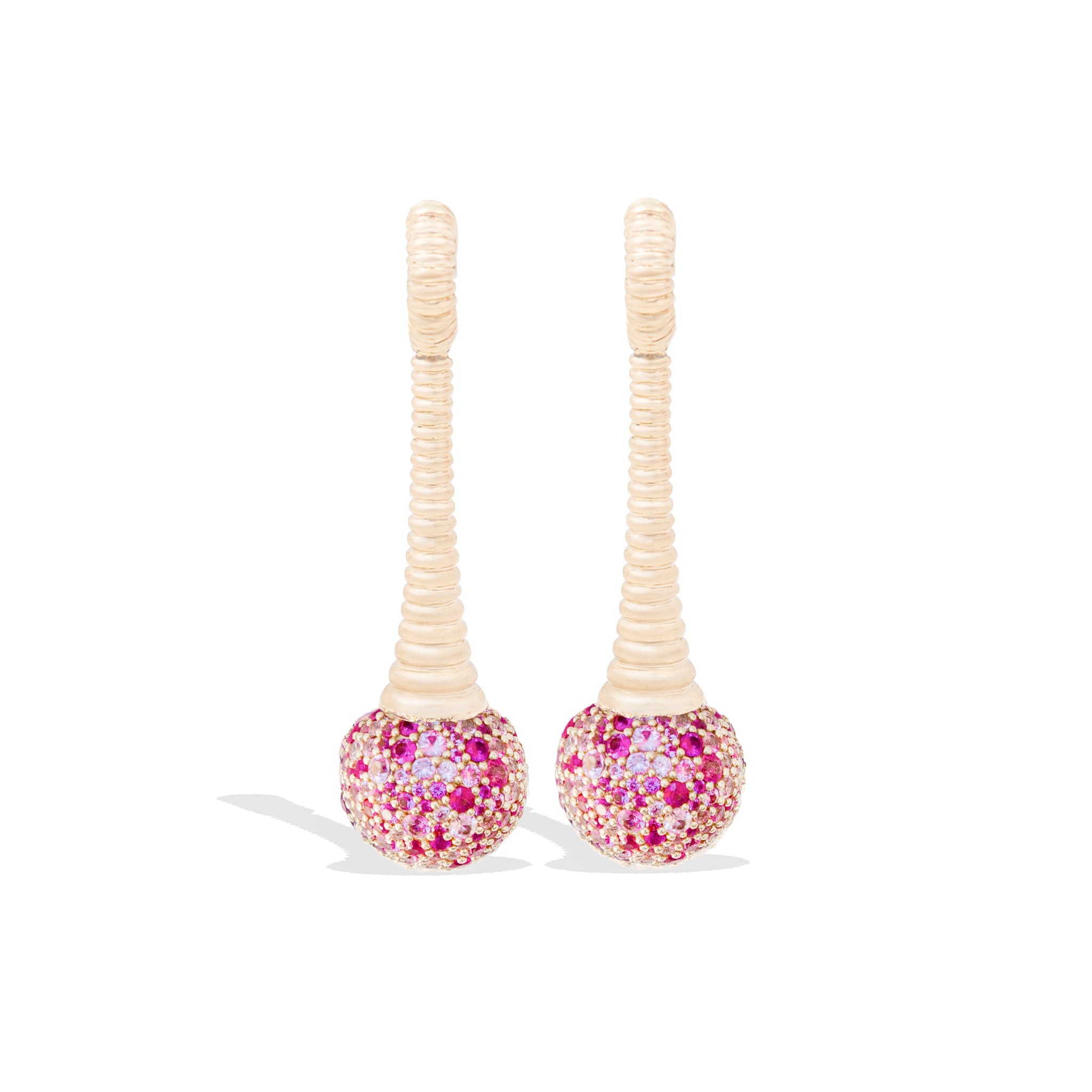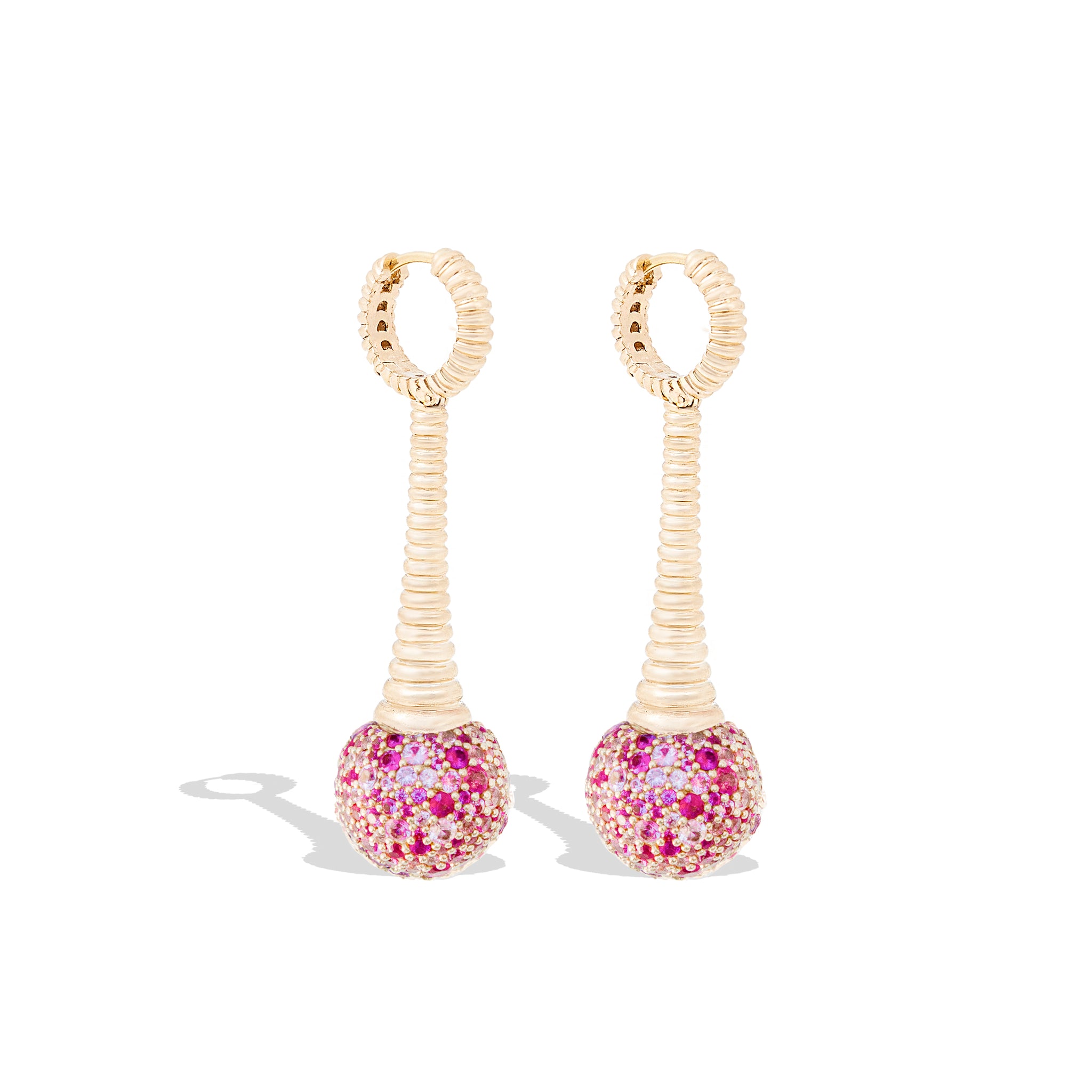 A playful take on the chandelier earring, the Revel Bobble Chandelier Earring features a large sphere completely covered in multi-color pave set pink sapphires hanging from a sculptural ribbed component. The earring is anchored by a classic ribbed huggie with a hinge, allowing a playful amount of movement in this whimsical design.