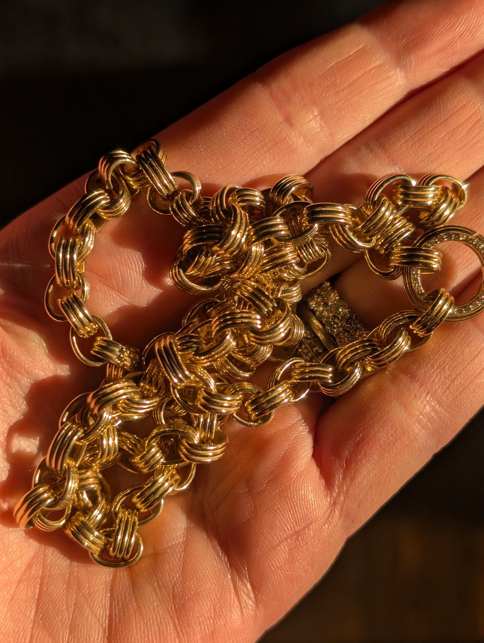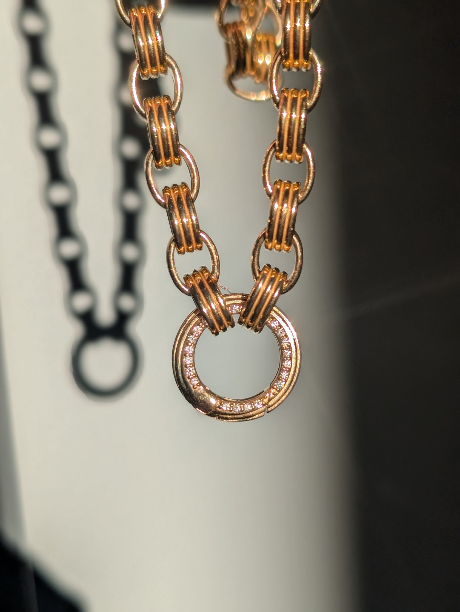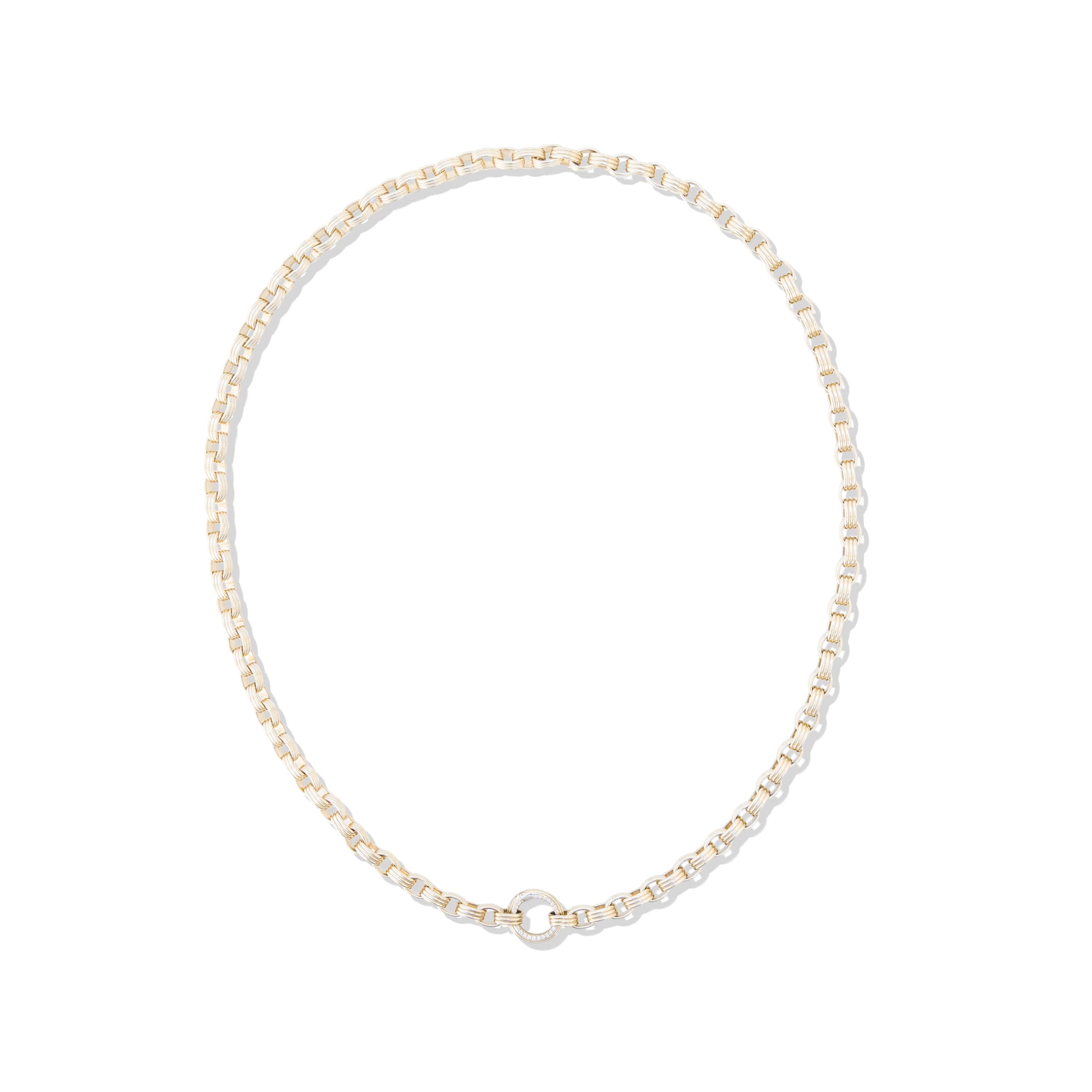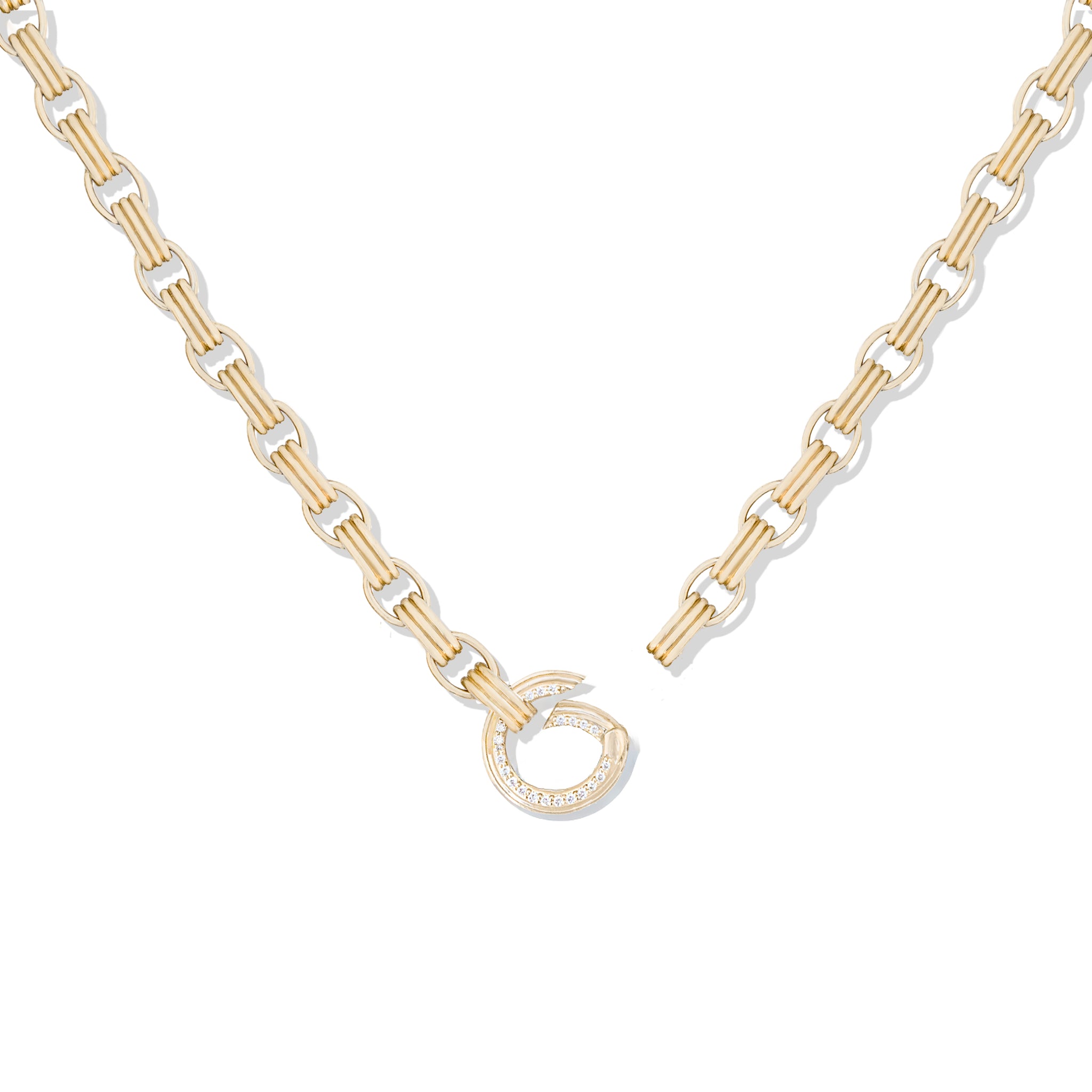 Our Family Heirloom Large Charm Loop Necklace is designed to hold your Family Alphabet & Family Medallion charms as well as allow space for your existing collection of charms. This unique and custom chain features substantial oval shaped links adorned with our signature ribbing detail that form a statement chain you will wear with everything. The charm loop features pave set diamonds, fits smoothly onto the chain and opens easily to allow your charm collection to change or grow over time. An absolute must for any jewelry collection, a charm loop allows you to mix and match your charm collection and pairs perfectly with our Family Alphabet & Family Medallion Collections.