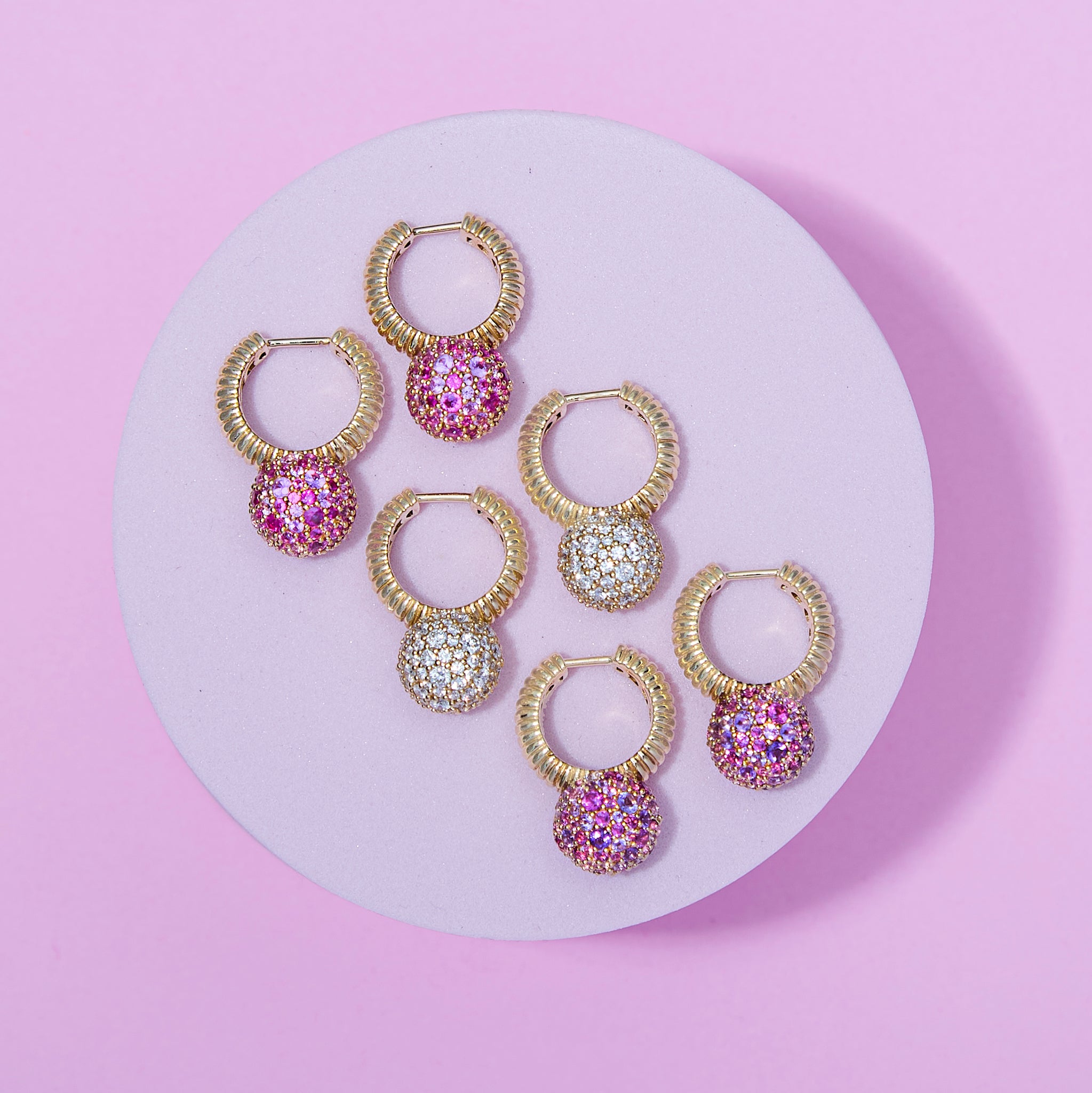 A playful take on the huggie earring, the Revel Bobble Huggie features a sphere drop completely covered in pave set diamonds. The sphere is anchored by a textural ribbed huggie, creating earring with subtle movement. These playful earrings are designed to delivery versatility - giving you the option to easily dress up or down depending on the occasion.