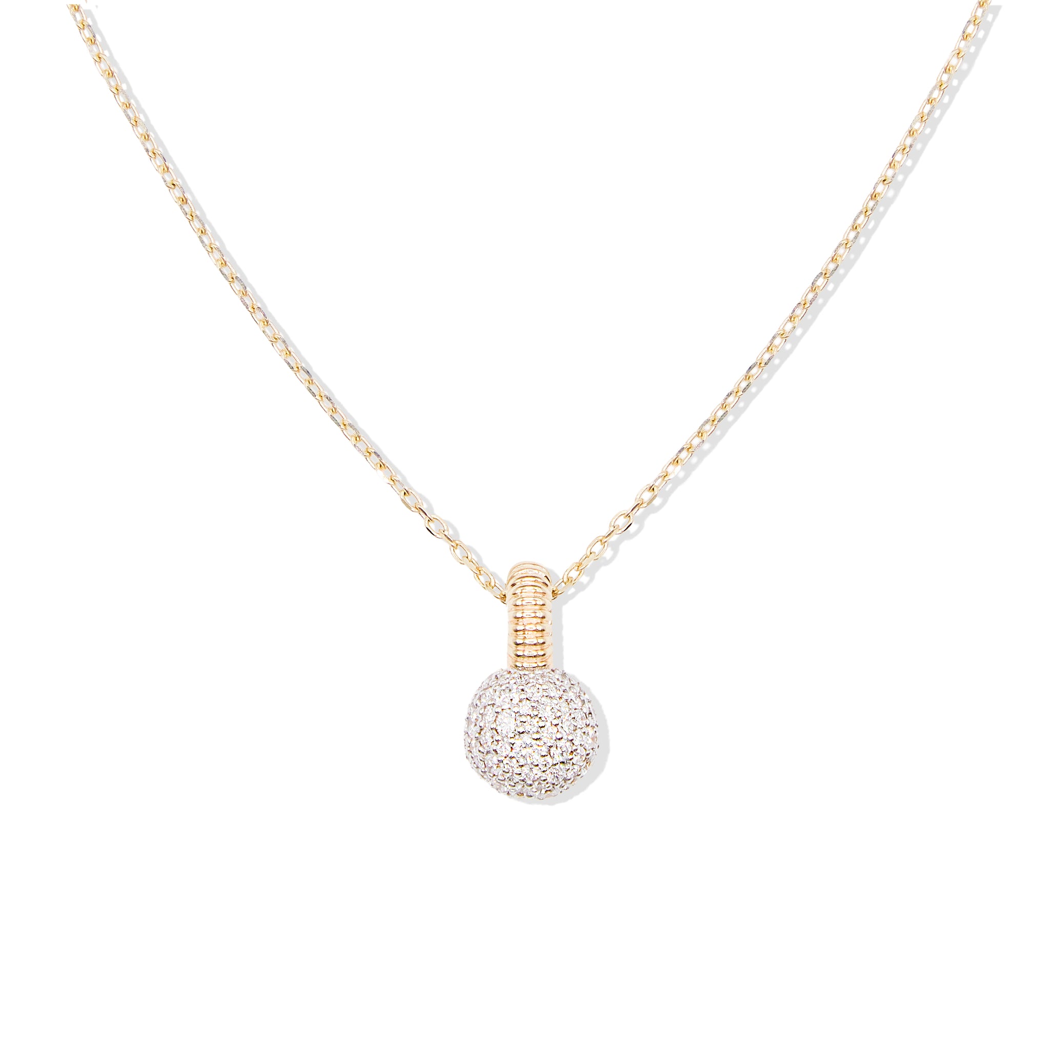 The Revel Medium Bobble Charm Necklace is a refined take on everyday sparkle, offering a slightly bolder expression of softness and structure. The high-polish gold orb is accented with a pavé cluster of diamonds, creating dimensional shine and light-catching detail. Finished with a ribbed bail for an architectural touch, the pendant is suspended from a two-tone diamond-cut cable chain for a modern contrast.