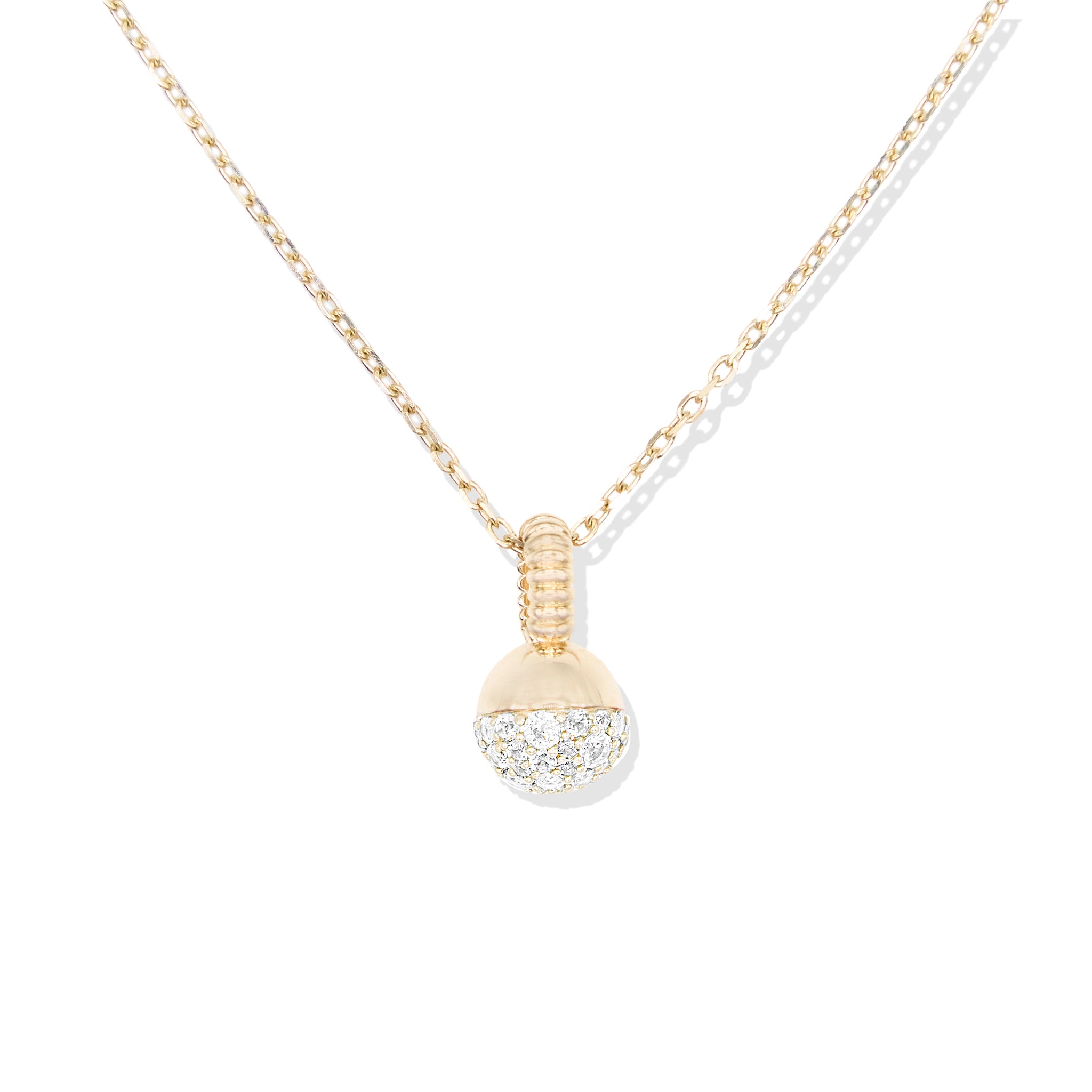 The Revel Small Bobble Charm Necklace is a refined take on everyday sparkle, this petite sphere pendant balances softness with structure. The high-polish gold orb is accented with a pavé cluster of white diamonds, creating subtle dimension and light-catching detail. Finished with a ribbed bail for an architectural touch, the pendant is suspended from a two-tone diamond-cut cable chain for a modern contrast.