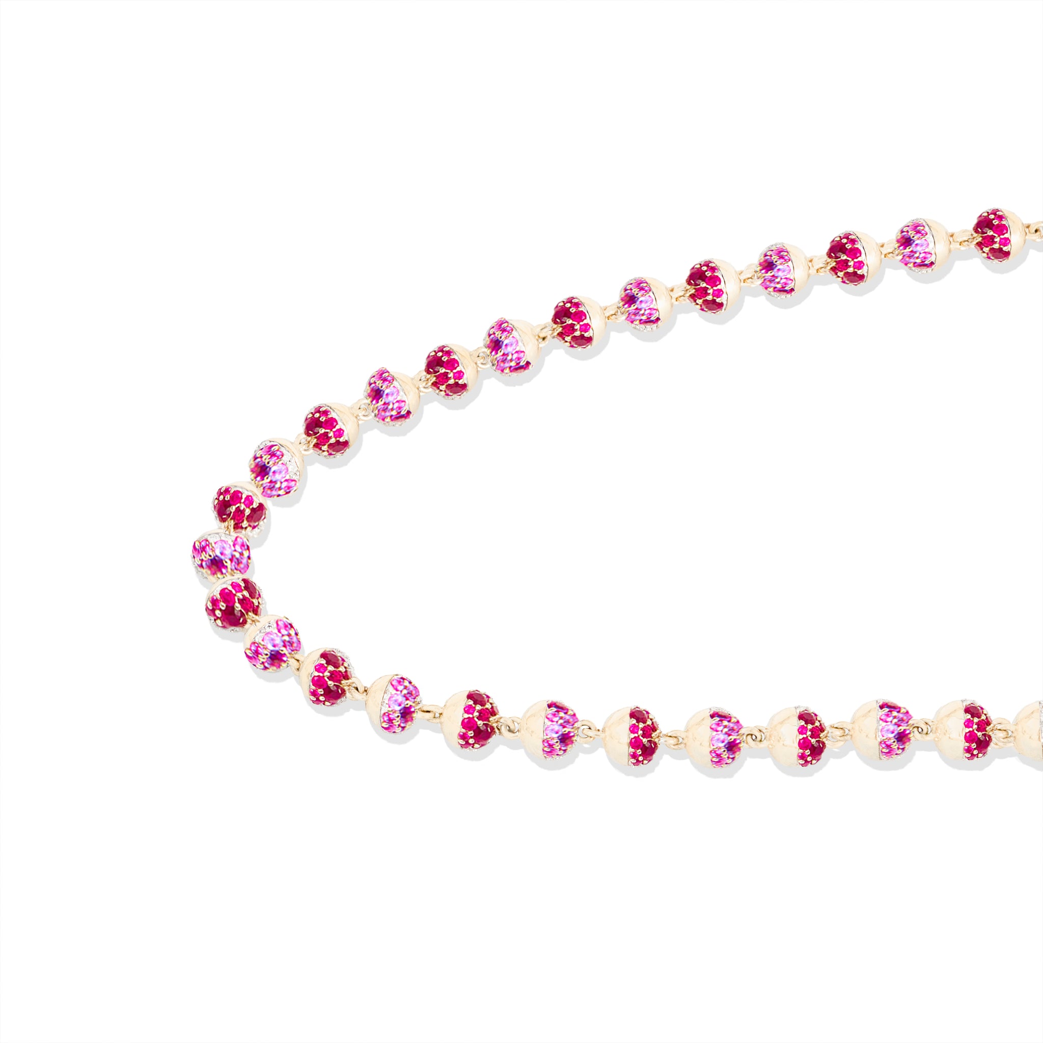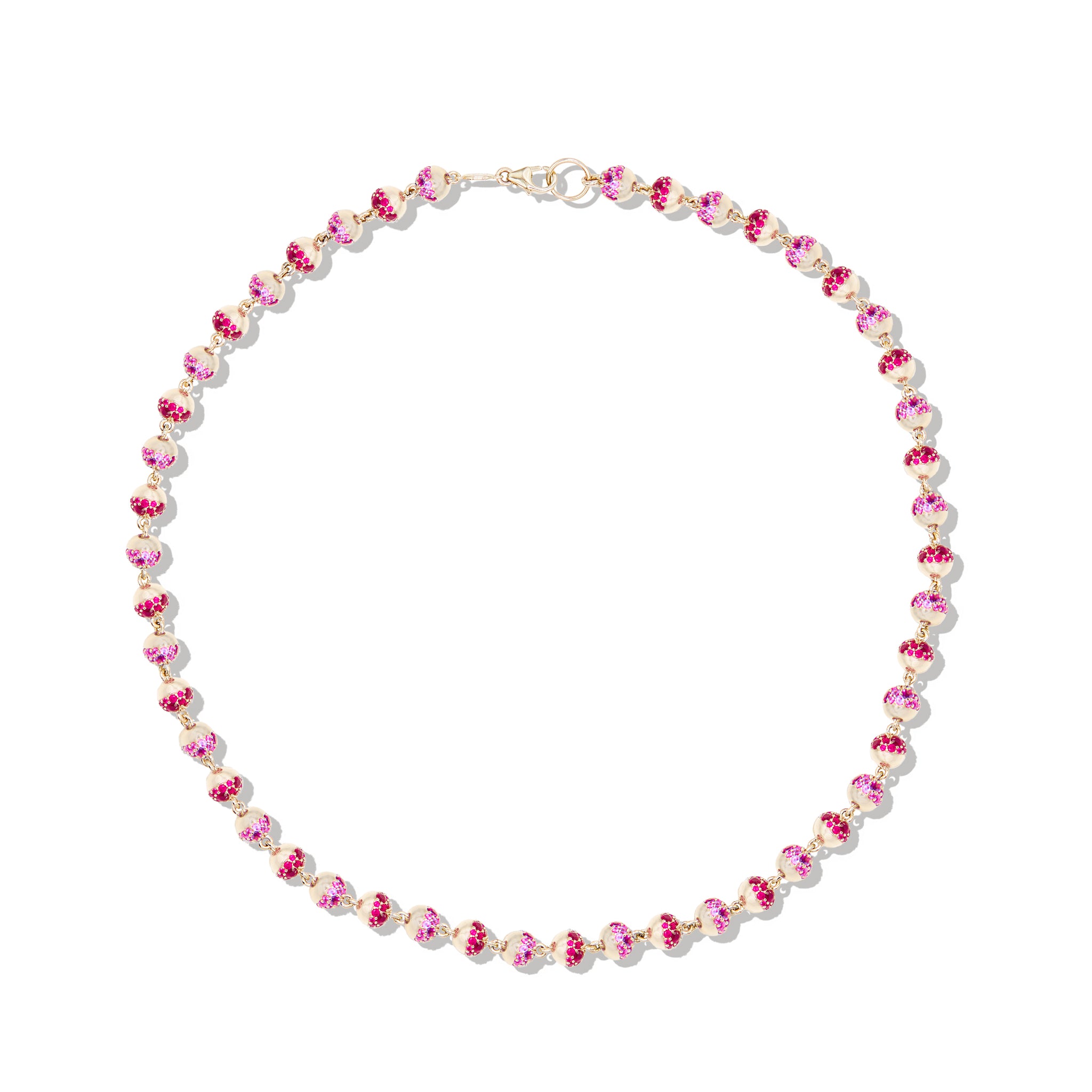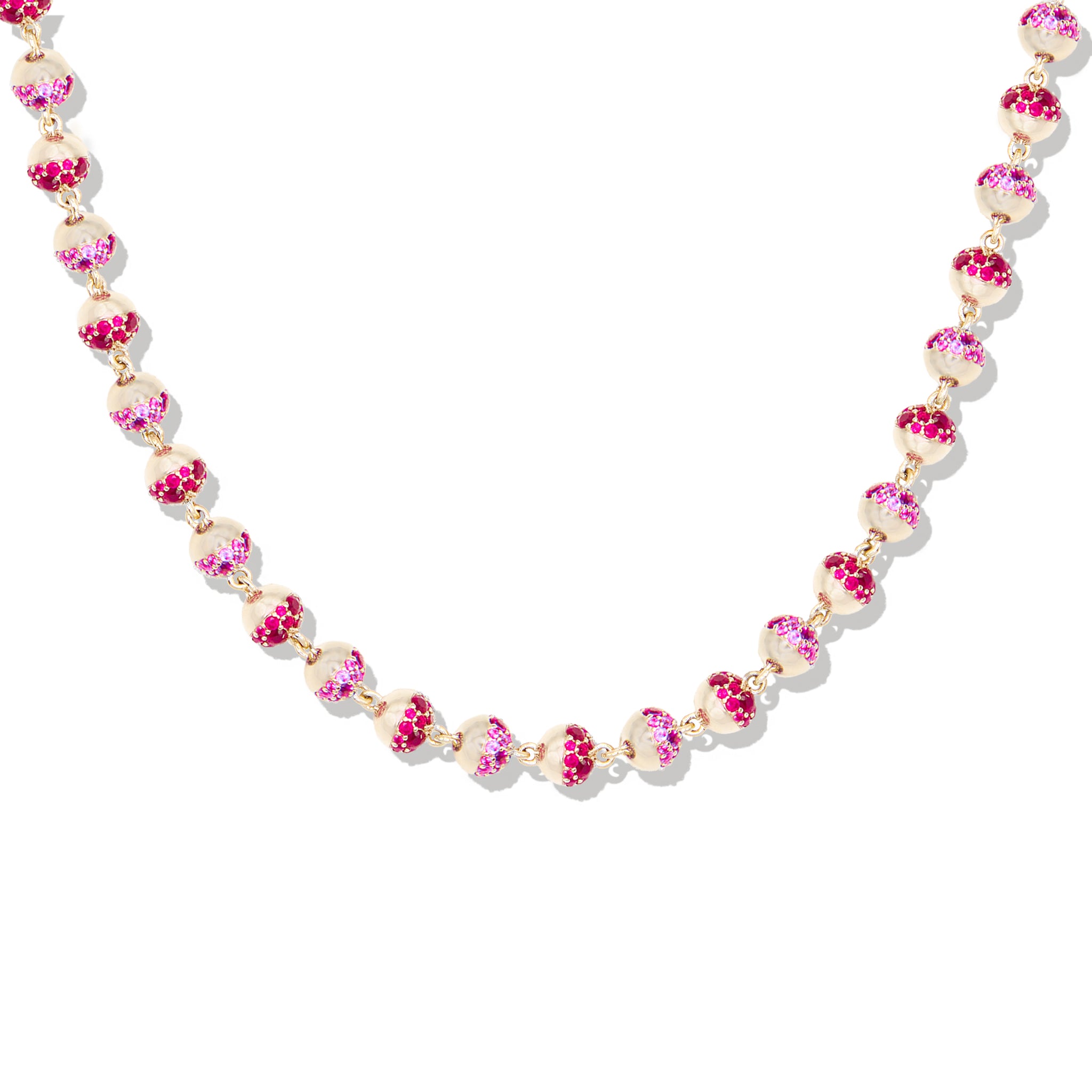 The Revel Small Pavé Bead Necklace is a refined expression of everyday sparkle. Featuring a continuous strand of petite spherical beads, each element pairs high-polish gold with pavé-set rubies and pink sapphires for dimensional contrast and light-catching shine throughout.