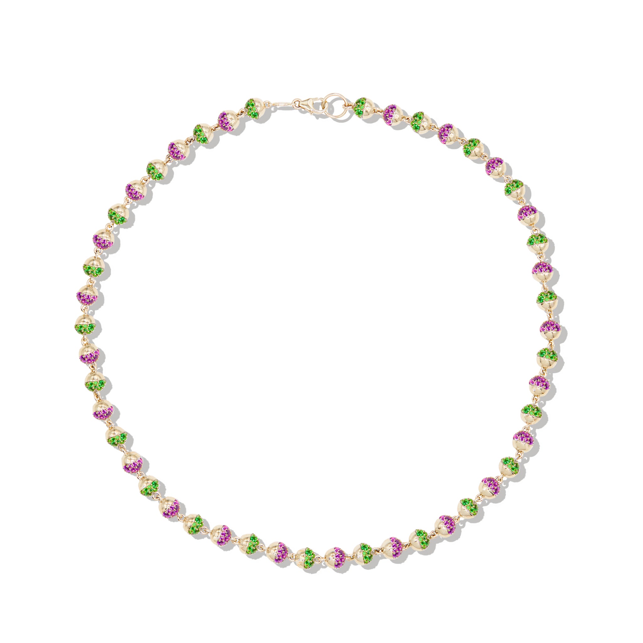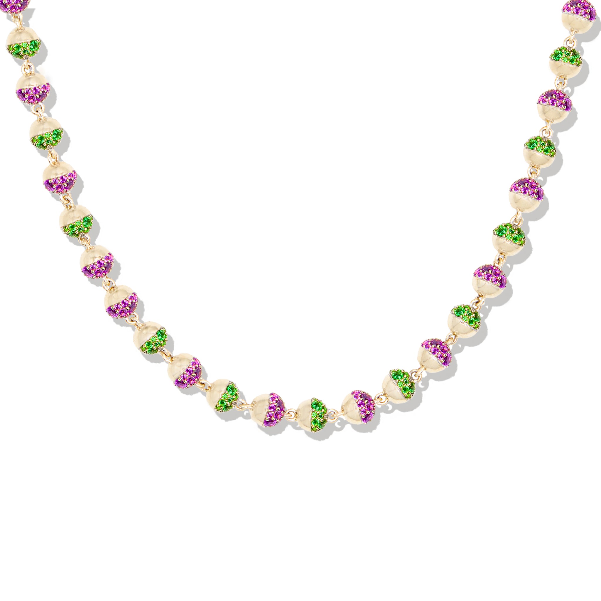 The Revel Small Pavé Bead Necklace is a refined expression of everyday sparkle. Featuring a continuous strand of petite spherical beads, each element pairs high-polish gold with pavé-set tsavorite and rhodolite garnet for dimensional contrast and light-catching shine throughout.