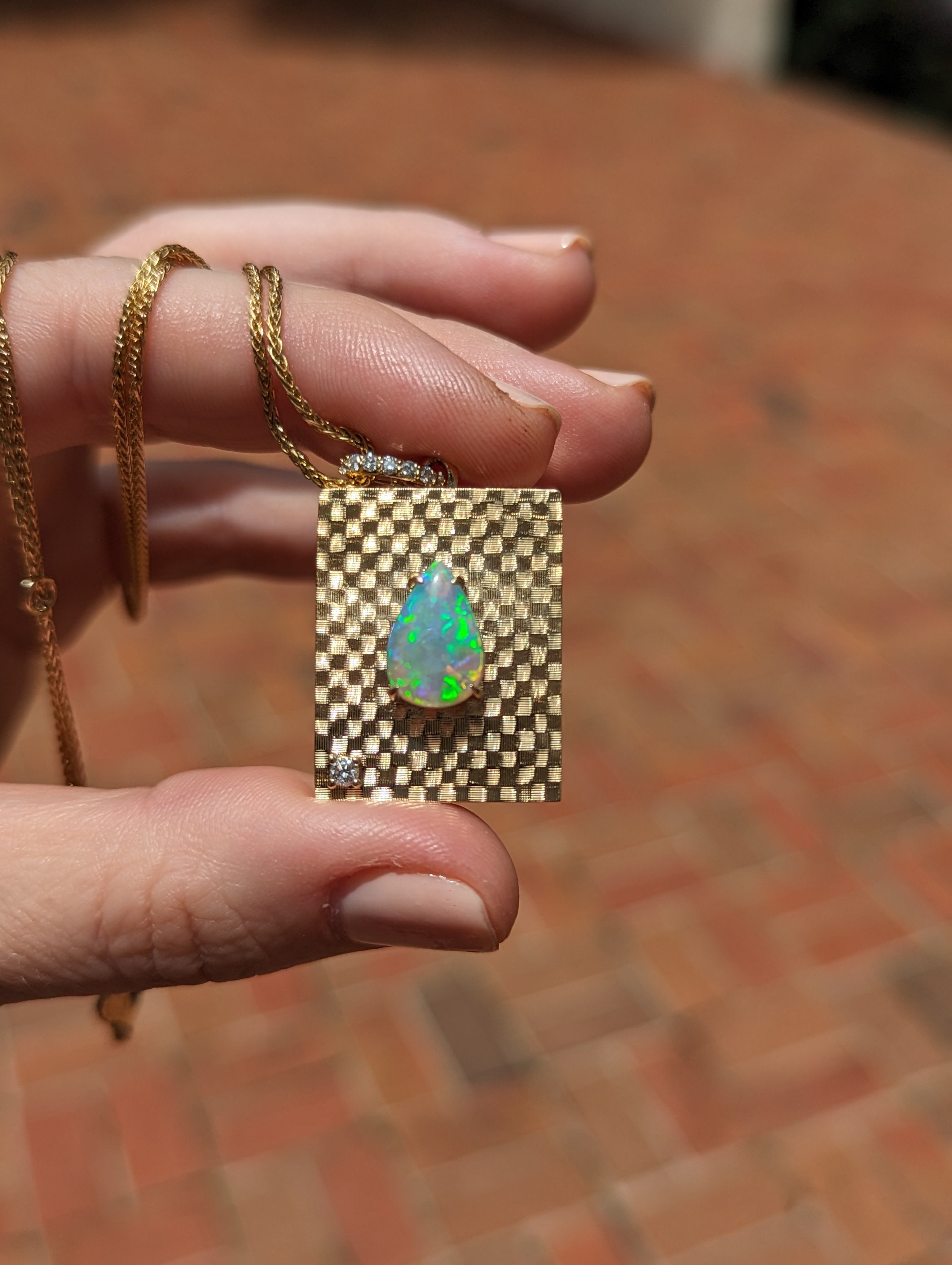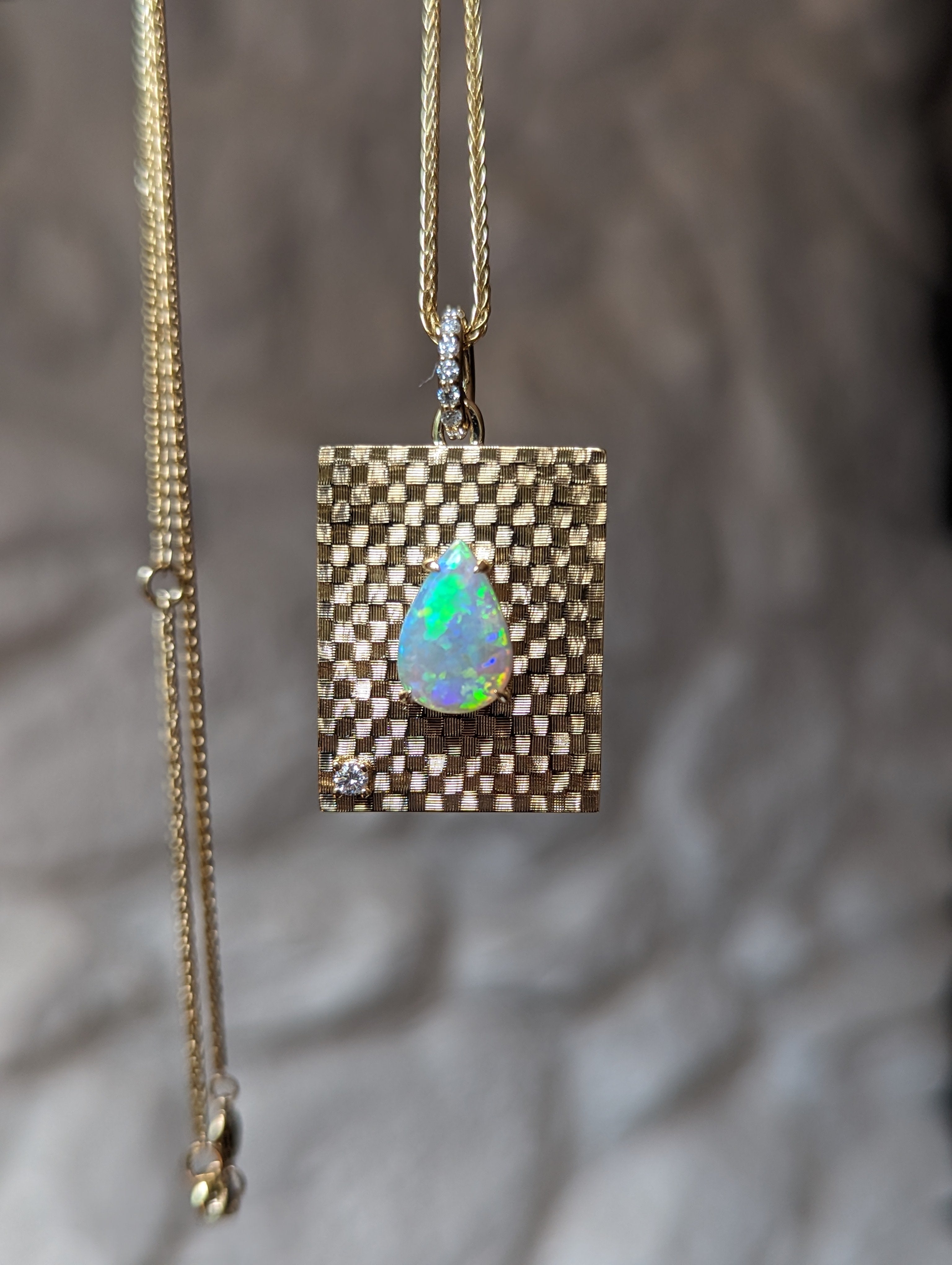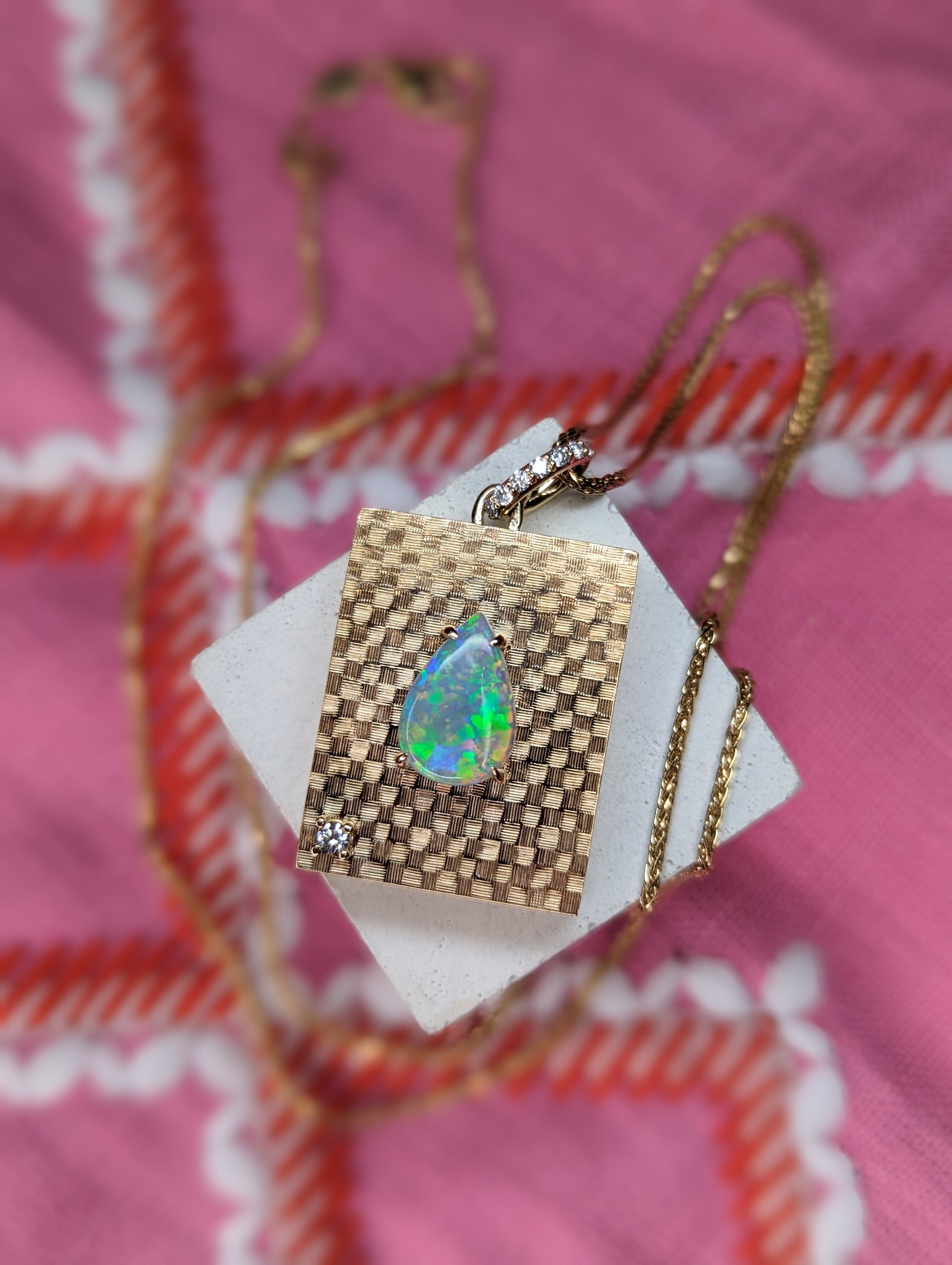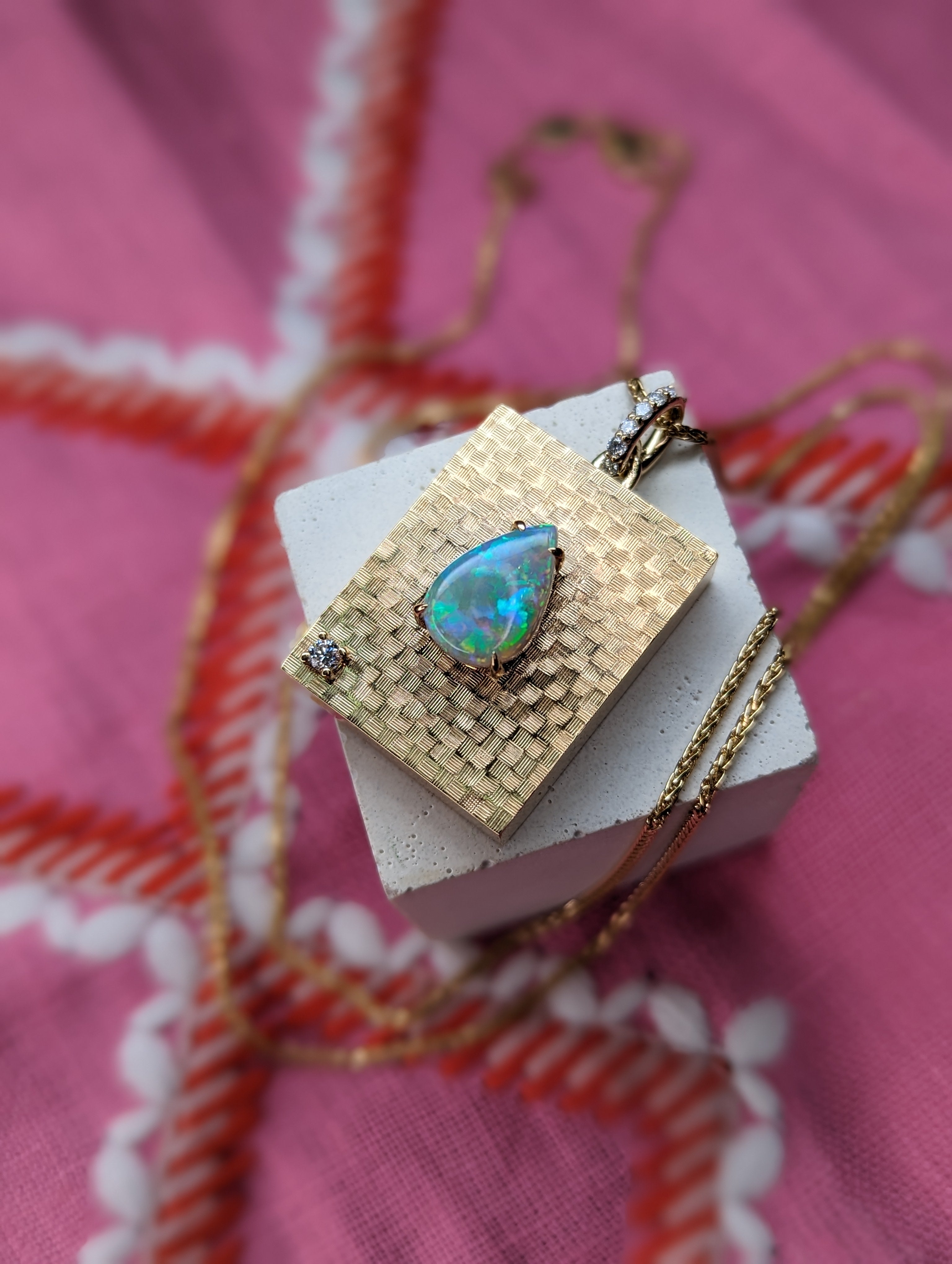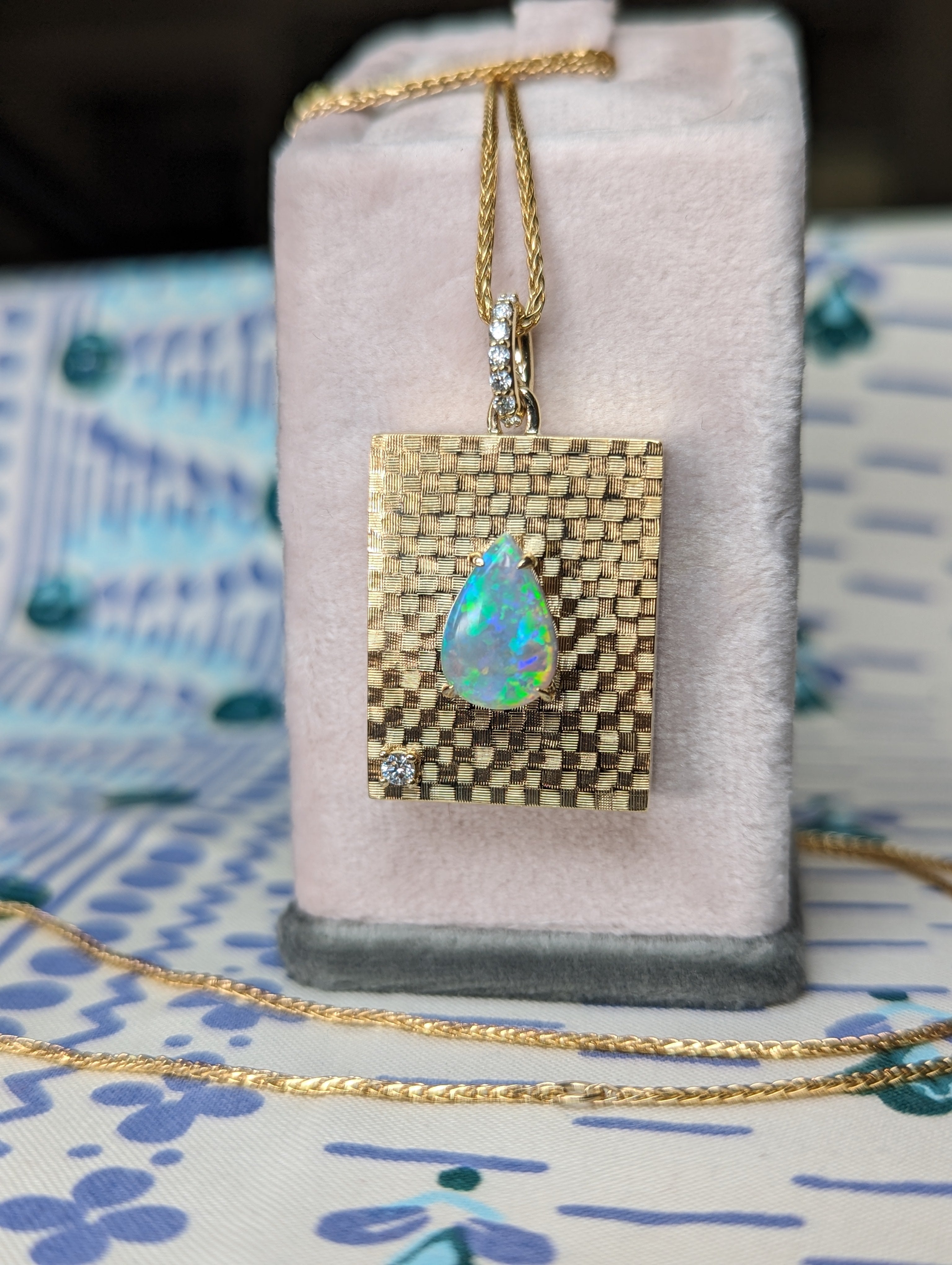 One of our favorite custom transformations of all time. This client came to us with a number of inherited pieces, including a meaningful gold pill box & a simple opal pendant. We made some minor modifications to the pill box, set the opal into it and created a completely bespoke & one-of-a-kind pendant. The best part? We preserved the sentimental engraving on the original pill box.
